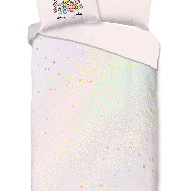 Pure kinderdekbedovertrek Mandy Unicorn is een regenboog kleuren dekbedovertrek met afbeeldingen van een unicorn op de kussensloop. Het beddengoed is gemaakt van 100% microvezel. Lees meer.