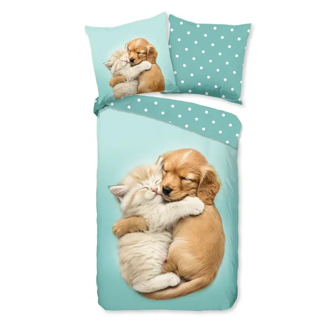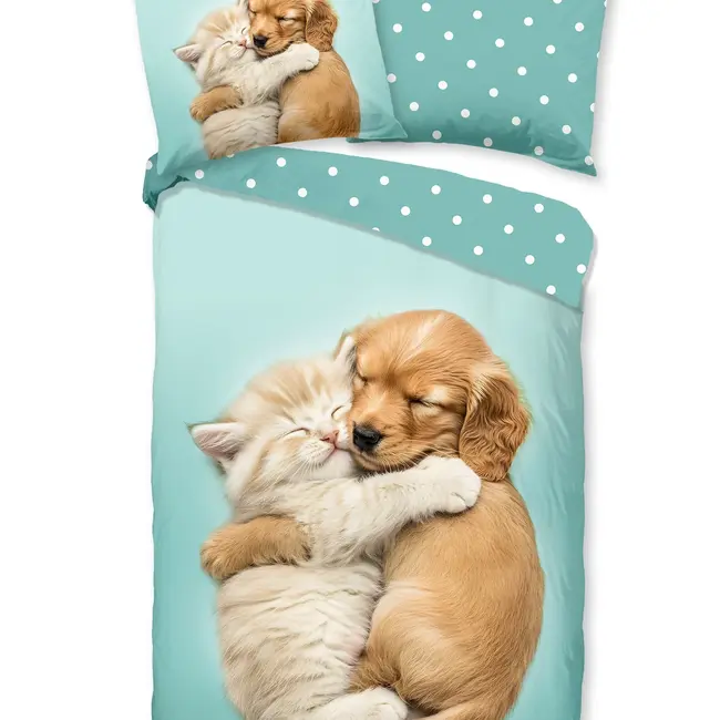 Met dit dekbedovertrek kies je voor een combinatie van sfeer, comfort en gebruiksgemak. De lieve print van kitten en puppy straalt rust en geborgenheid uit, terwijl de mintgroene onderzijde met stippen een speelse twist brengt. Dankzij de 100% katoen kwaliteit geniet je van ademend slaapcomfort en een zachte aanraking op de huid. De instopstrook zorgt ervoor dat het dekbed netjes blijft zitten, en het dekbedovertrek is eenvoudig te onderhouden — wassen op 40 °C zonder dat de kleuren vervagen. Kortom: een liefdevolle, praktische en duurzame keuze voor de kinderkamer.
