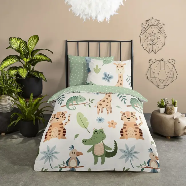 Als je op zoek bent naar beddengoed dat zowel praktisch, comfortabel als stijlvol is, dan is dit kinderdekbedovertrek een uitstekende keuze. Het vrolijke jungle‑design stimuleert fantasie en vrolijkheid in de kamer, wat kinderen vaak leuk vinden. Door de ademende katoenen stof slaapt je kind de hele nacht lekker zonder te warm of te klam. De omkeerbare print geeft je ook flexibiliteit om met het interieur te spelen, en de duurzame kwaliteit zorgt dat je er lang plezier van hebt. Kortom: met het “Sabah” dekbedovertrek haal je in één keer een slimme combinatie van comfort, kwaliteit en vrolijkheid in huis.