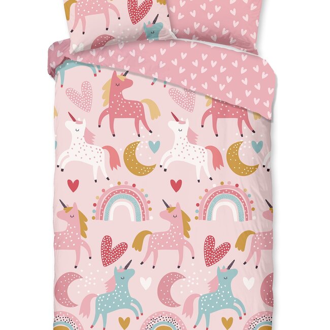 De lieve eenhoorns en sprankelende regenbogen maken dit overtrek tot een echte blikvanger in de kinderkamer. Het vrolijke design prikkelt de fantasie van je kind en zorgt voor een magische, inspirerende sfeer waarin dromen tot leven komen.