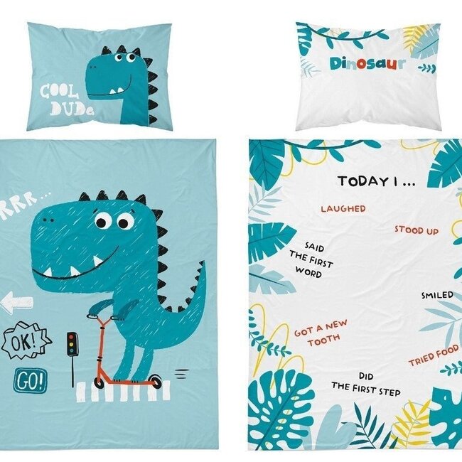 Ledikant dekbedovertrek met een luiaard dino op een skateboard en de tekst Cool dude. Het dekbed overtrek is gemaakt van 100% katoen. De kussensloop en het dekbedovertrek hebben een ritssluiting. Het dekbedovertrek is dubbelzijdig te gebruiken, dus wil je Lees meer.