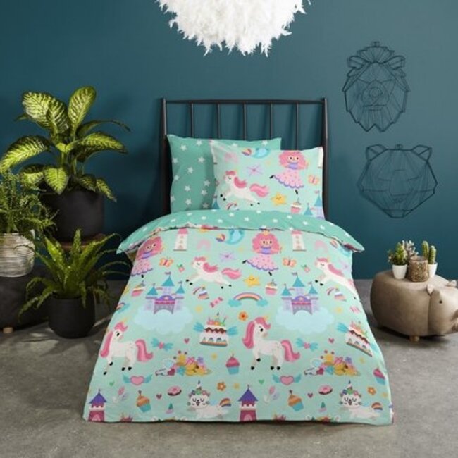 Het ontwerp van dit dekbedovertrek is een ware fantasie-ontsnapping met prachtige afbeeldingen van sierlijke eenhoorns, omringd door regenbogen, sterren en prinsessen. De levendige kleuren en gedetailleerde prints creëren een betoverende sfeer die perfect is voor jonge dromers en eenhoornliefhebbers.