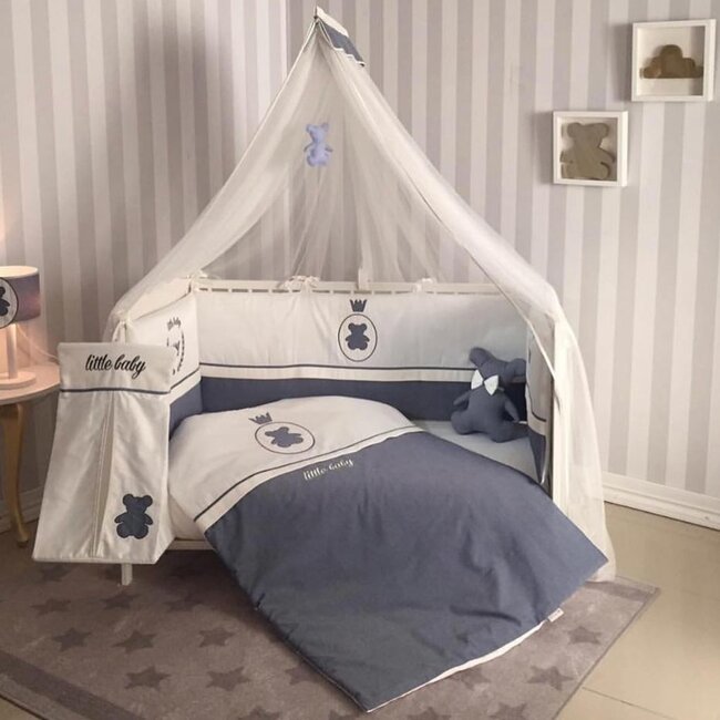 Het ledikant dekbedovertrek set "Blauw Beertje" is een lief en zacht overtrek voor de babykamer. Het overtrek heeft een schattige print van een blauw beertje.