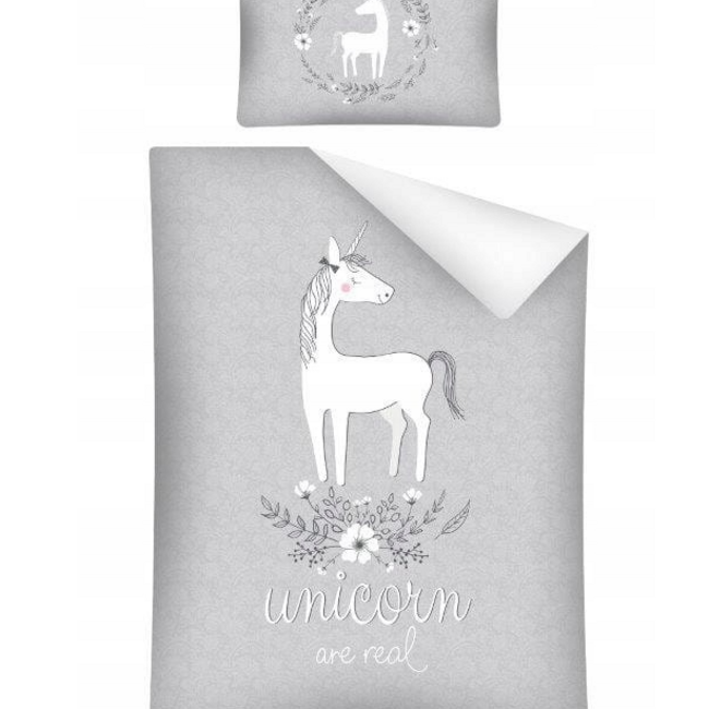 Dit ledikant dekbedovertrek heeft een schattig en speels ontwerp met een eenhoorn als centraal thema. Het overtrek is grijs, met een grote afbeelding van een lieve, lachende eenhoorn in de kleur wit. Onder de eenhoorn staat de tekst "Unicorn are real" in sierlijke letters, wat een dromerige en fantasierijke uitstraling geeft.