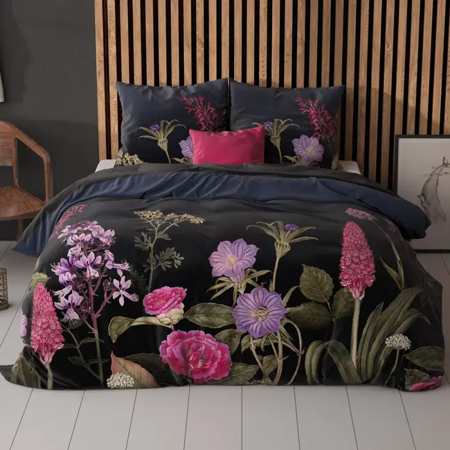 Het Dekbedovertrek Feline heeft prachtig gekleurde bloemen verspreid over een deel van het oppervlak in vele gevarieerde tinten. Deze speelse elementen brengen een rustieke sfeer naar je slaapkamer. Dankzij de digitale print geniet je van haarscherpe details en levendige kleuren die lang mooi blijven. En wil je even een ander beeld in je slaapkamer, dan draai je het dekbed gewoon even om voor een rustige donkergroene effen oppervlak. En wil je even iets anders, dan draai je het dekbed om voor een egale zwarte ondergrond.