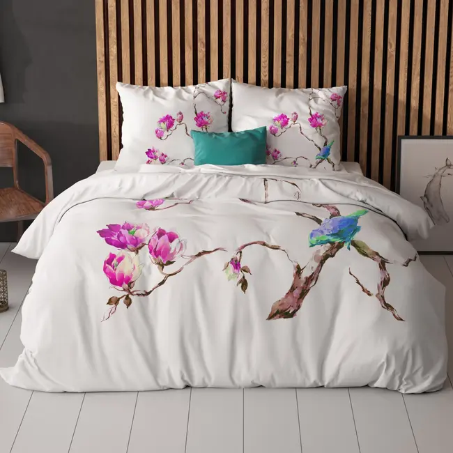 Dekbedovertrek Magnolias laat een mooie magnoliatak zien met kleurrijke bloemen en een rustende vogel. Deze fleurige elementen brengen een lenteachtige sfeer naar je slaapkamer, perfect voor een frisse, lente uitstraling. Dankzij de digitale print geniet je van haarscherpe details en levendige kleuren die lang mooi blijven.