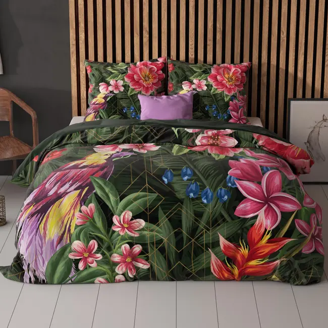 Het Microvezel Dekbedovertrek Milou heeft prachtige kleurige bloemen verspreid over het hele oppervlak in vele gevarieerde tinten. Deze speelse elementen brengen een frisse, tropische sfeer naar je slaapkamer. Dankzij de digitale print geniet je van haarscherpe details en levendige kleuren die lang mooi blijven. En wil je even een ander beeld in je slaapkamer, dan draai je het dekbed gewoon even om voor een rustige donkergroene effen oppervlak.