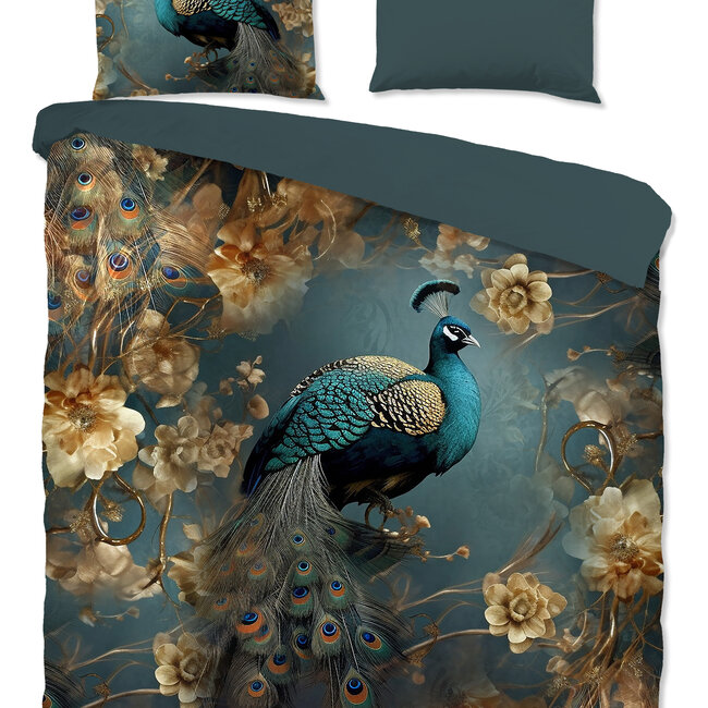 Het dekbedovertrek Savaya pauw van Pure Luxury is een overtrek met een prachtige foto van een pauw tussen bloemen.