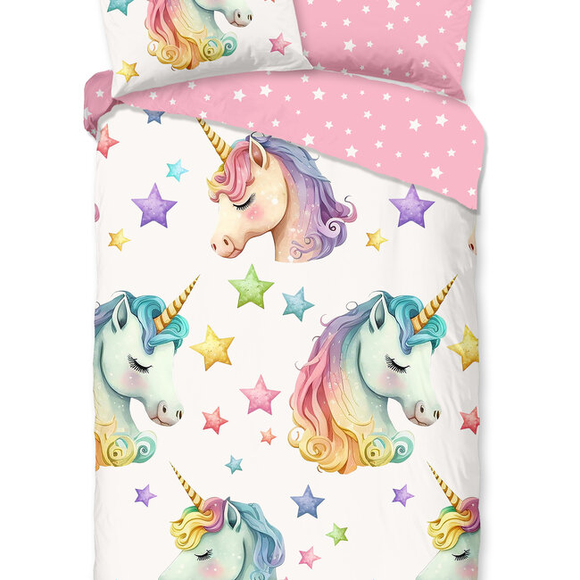 Droom zacht met het ‘Fancy’ dekbedovertrek. Ben jij een echte eenhoornliefhebber? Dan is het ‘Fancy’ eenpersoons dekbedovertrek perfect voor jou! Dit schattige dekbedovertrek heeft een afbeelding van een prachtige eenhoorn op een witte ondergrond omringd door kleurige sterren, wat zorgt voor een warme en knusse uitstraling. De achterzijde is speels en stijlvol met een roze design met witte sterren, zodat je het bed eenvoudig kunt omdraaien voor een frisse look.