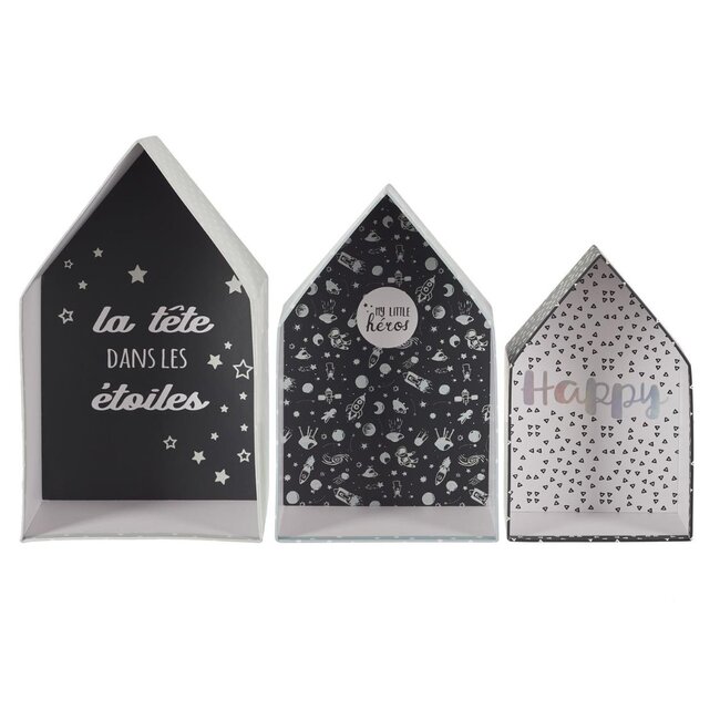 Gemaakt van stevig karton, bieden deze nestkastjes een veilige en knusse plek om kleine spulletjes in op te bergen. De set bestaat uit drie opvolgende maten kastjes, waardoor ze perfect zijn om te stapelen of naast elkaar te plaatsen als decoratief accent in de kinderkamer.