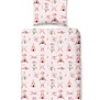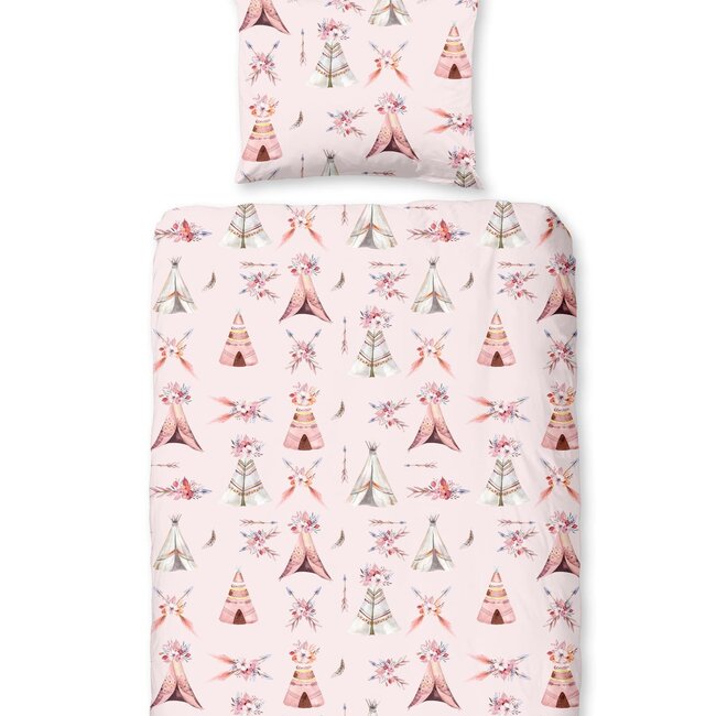 Het Good Morning Boho dekbedovertrek is een vrolijke aanvulling voor de slaapkamer. Het roze ontwerp toont verschillende tipi's in wit en donkerroze, met tussen de tenten diverse figuurtjes. Bloemen, veren en pijlen maken het geheel af. De dubbelzijdige print loopt door op het bijpassende kussensloop, zodat je elke avond heerlijk in slaap valt.