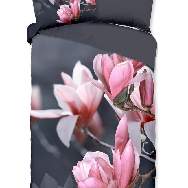 Pure dekbedovertrek Macy is een antraciet kleur dekbedhoes met een print van roze Magnolia bloemen.