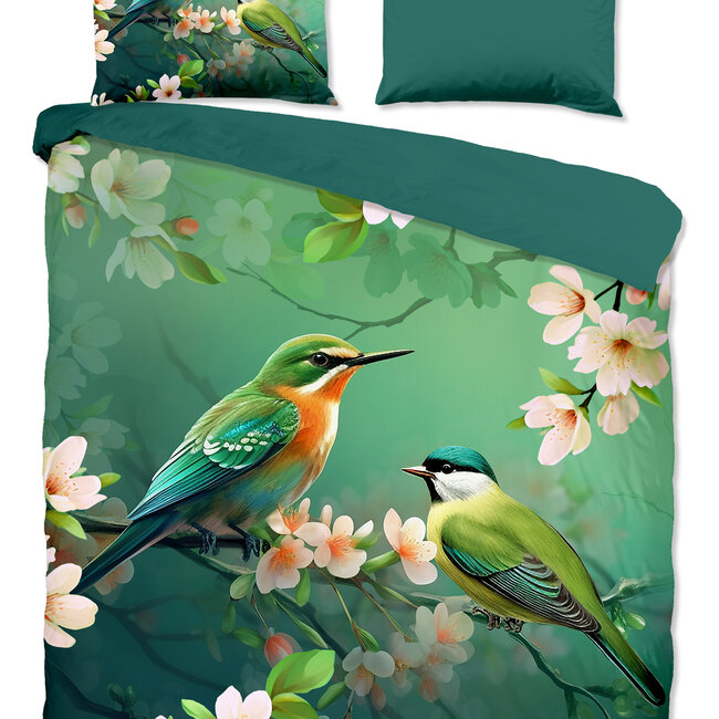 Dekbedovertrek Signi van Pure met vogels en bloesemtak in de kleur groen is gemaakt van 100% polyester/microfiber. Het is geschikt voor ieder jaargetijde en door de lichte glans heeft het een luxe uitstraling.