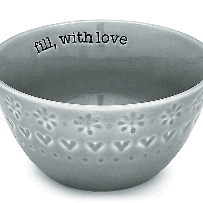Grijze stenen schaaltje met 'filled with love' voor bijvoorbeeld muesli of snacks. Gemaakt van keramiek. Vaatwasmachine en magnetron bestendig.