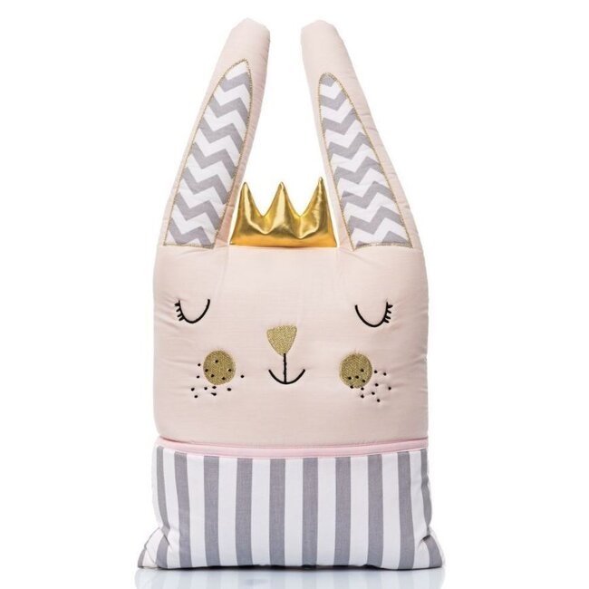Sierkussen in de vorm van een konijn met gouden kroontje. Lees meer.