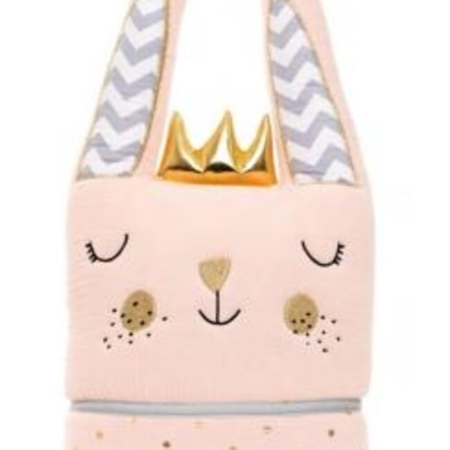 Sierkussen in de vorm van een konijn met gouden kroontje. Lees meer.
