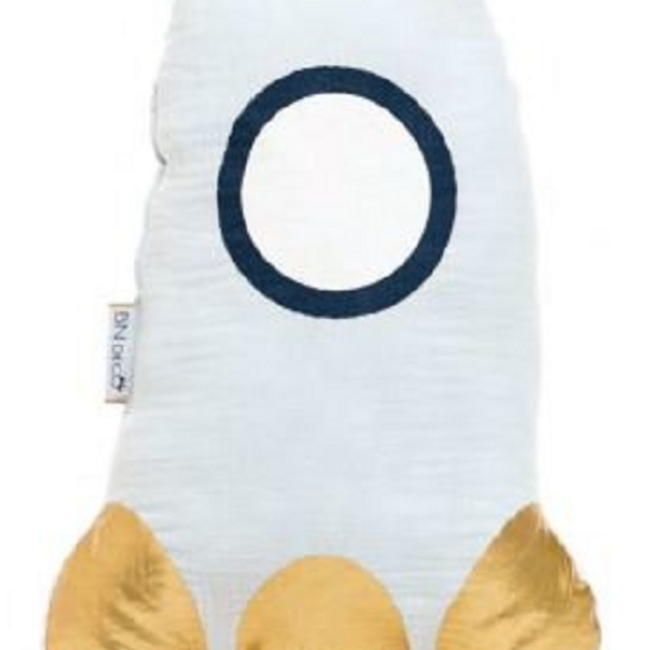 Sierkussen in de vorm van een Raket met gouden accenten. Lees meer.