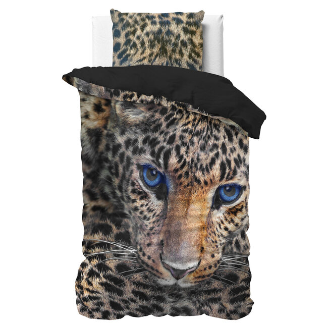 Het Sleeptime Cheetah dekbedovertrek is een echte eyecatcher in de slaapkamer. Het prachtige dier kijkt je recht aan met zijn helderblauwe ogen. De achterkant van het overtrek is effen zwart. Hiermee creëer je een leuke omslag!