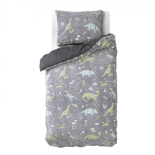 Super zachte fleece dekbedovertrek Dinosaurus is een grijs 1-persoons dekbedovertrek met dino's. Heerlijk warm in de winter. Om het dekbed nóg leuker te maken, heeft het een speciaal 'glow in the dark effect' dat alleen 's nachts te zien is. Superleuk dus om de kinderkamer helemaal af te maken!