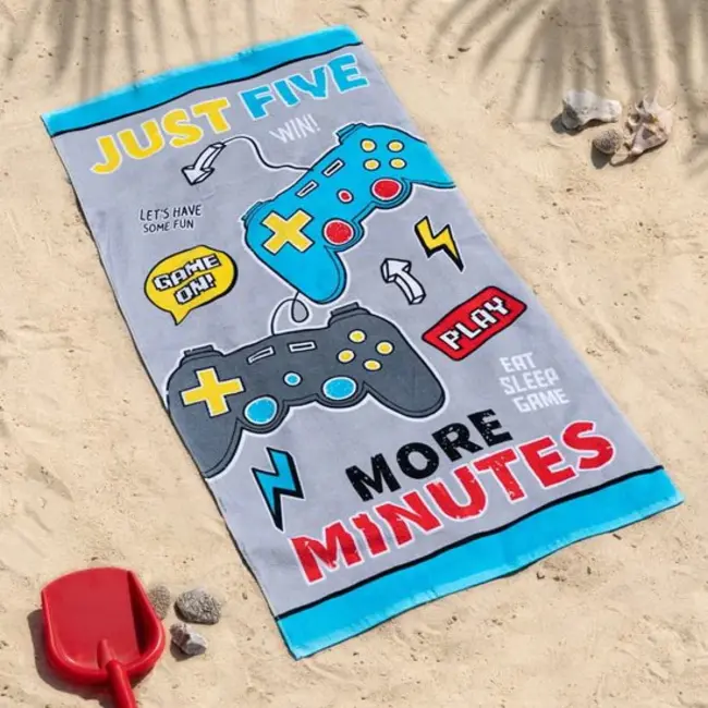 Strandlaken met controllers en verschillende gamer gerelateerde teksten. De afmeting van deze handdoek is 70x140 cm. Handdoek is gemaakt van katoen. Met dit strandlaken kun je je passie voor gamen laten zien, zelfs op het strand of bij het zwembad.