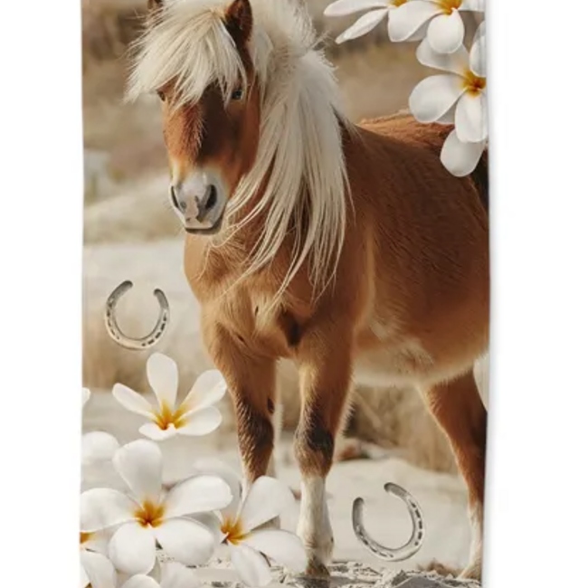 Een prachtig bruin paard staat afgebeeld op het Good Morning Fabi strandlaken. Het paard staat in de duinen op het strand en is omringd door mooie grote witte bloemen. Ook enkele hoefijzers zijn afgebeeld in de print. Hierdoor is het strandlaken een echte must-have voor de jongste paardenliefhebbers!